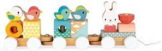 Een mooie 2-in-1 trein in subtiele en zeer actuele kleuren met schattige dieren: Een houten trein met drie wagons om de verbeelding van je kind te ontwikkelen en een trekspeelgoed om zijn of haar motoriek te stimuleren. De spoorweg bestaat uit 17 kleurrijke blokken in verschillende geometrische vormen, waarmee je baby de kleuren kan leren en zijn eerste bouwwerken kan maken. Details: Maat: 31,4 x 6,5 x 11,5 cm Materiaal: hout Leeftijd: vanaf 12 maanden Let op! Niet geschikt voor kinderen jonger dan 12 maanden. Verstikkingsgevaar door het lange koord.